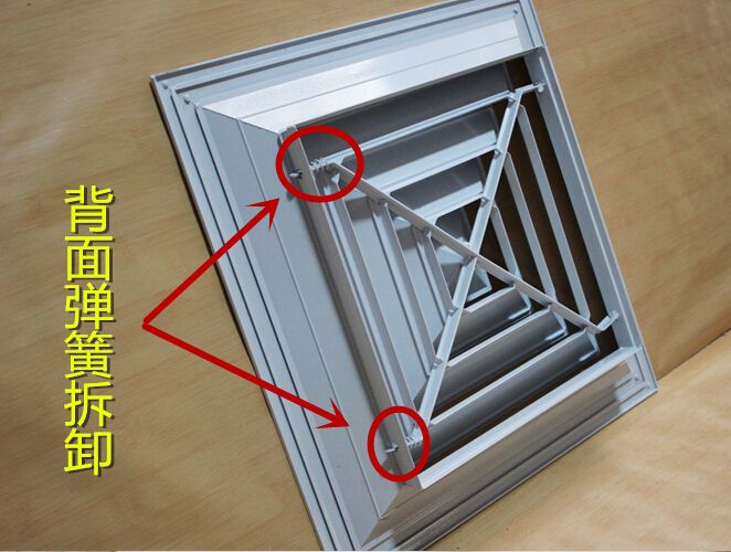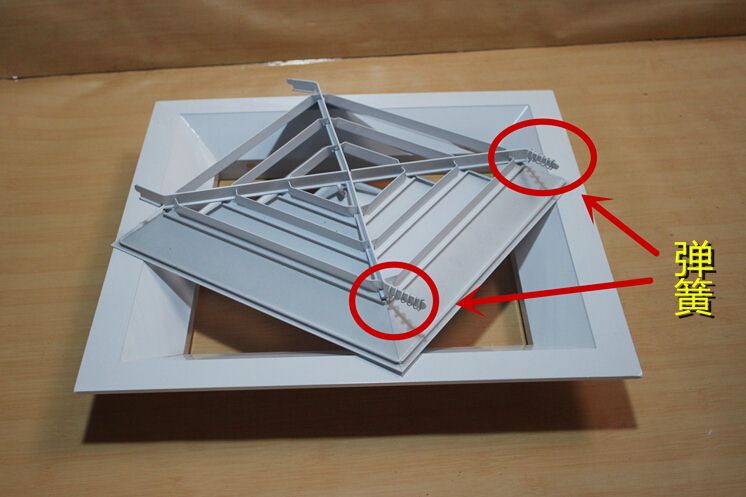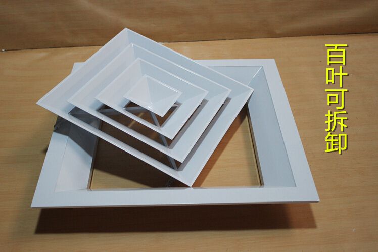 方型散流器使用该类型散流器时要与调节阀配合使用,才能在系统中得到理想的气流分布。此风口的叶片角度为固定式,不能随意调节,整个叶片与边框采用分离结构
